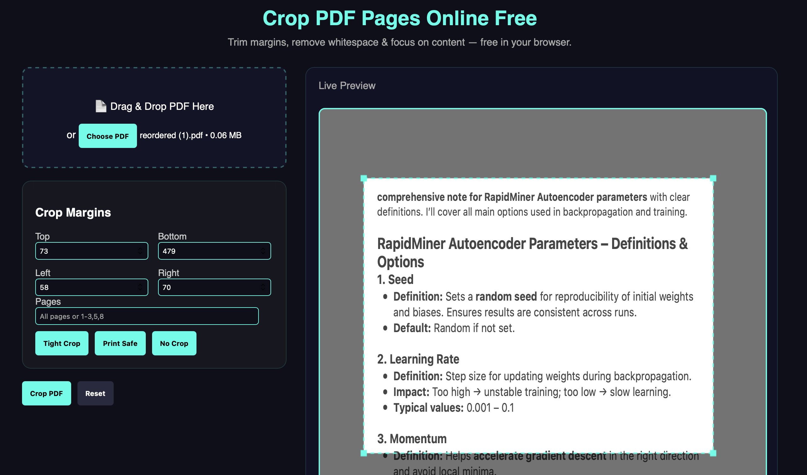 - Step 3: Apply the crop settings and download your trimmed PDF.